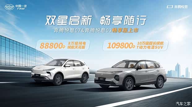 畅享长续航,击穿质价比!9月23日,一汽奔腾“悦意双子星”奔腾悦意07、奔腾悦意03畅享版正式上市。其中,“超长续航T动力电混SUV”奔腾悦意07 210km畅享版售价10.98万,“大大大纯电家享SUV”奔腾悦意03 565km畅享版售价8.88万,让用户以更低门槛享受更大出行自由。