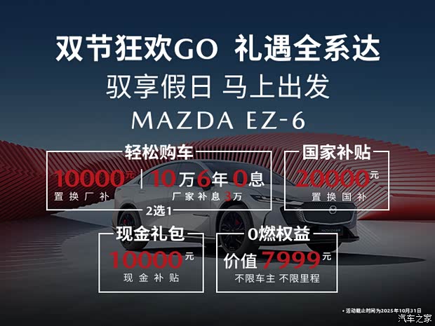 即日起至2025年10月31日下订购买长安马自达EZ-6车型,即可享双节礼遇!