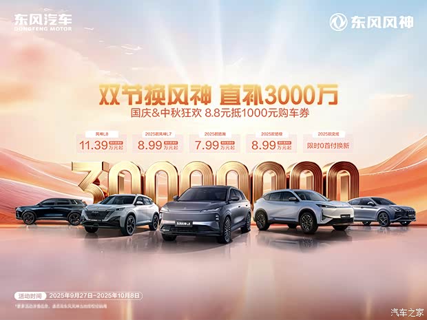 2025年10月1日-2025年10月31日24:00期间通过风神App/风神Club小程序成功下定并完成交车,享受上述限时豪礼,具体优惠政策及价格请咨询东风风神品牌经销