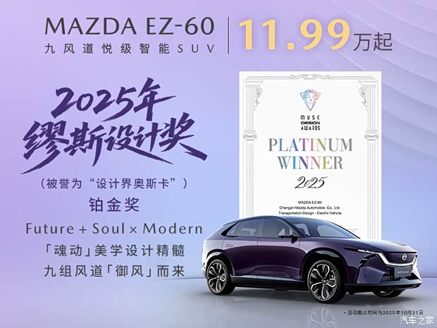 即日起至2025年10月31日下订购买长安马自达EZ-60车型,还可享七大购车权益!★升级礼:PRO和MAX版均可享受价值5000元的高阶配置权益免费升级;★安芯礼:不限车主、不限里程,价值7999元的终身零燃权益;★护航礼:限时特惠价399元抵1399元,享至高600万元驾驶辅助、泊车辅助保障;★金融礼:0首付起12-60期超低息贷款,年均费率低至1.99%;★补能礼:价值899元充/放电枪免费送;★畅玩礼:基础流量终身免费,娱乐流量2年免费(10G/月);★无忧礼:免费上门取送车及服务延时补贴如今,这台被缪斯女神亲吻过的艺术品已翩然而至。它既拥有摄人心魄的惊艳外表,也内藏荣获“十佳车身”的硬核守护。它证明,极致的安全与极致的优雅,本可兼得。即刻莅临长安马自达展厅,亲身品鉴这台铂金奖之作。让MAZDA EZ-60的魂动美学,成为您生活中最动人的风景线。
