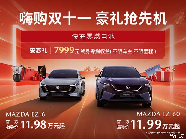 即日起至2025年11月30日下订购买长安马自达EZ家族车型,还可享价值7999元的终身零燃权益,不限车主,不限里程。同时还可享车型专属豪礼!