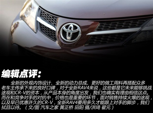 全新的外观内饰设计、全新的动力总成、更好的做工用料再搭配众多老车主传承下来的良好口碑,对于全新RAV4来说,这些都是它未来能够挑战途观和CR-V的资本,从产品本身的角度出发,我们也确实有理由相信这点。而在和竞争对手的对抗中,价格也是重要的环节,面对销售持续火爆的途观,以及早已优惠许久的CR-V,全新RAV4要用多久才能跟上对手的脚步,我们拭目以待。(文/图 汽车之家 黄正桥 田阳 摄/洪琦 翟元)