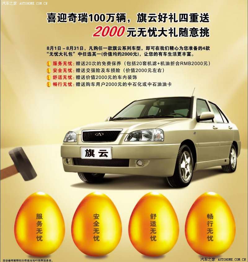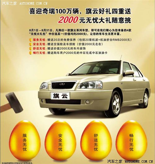 8月下旬,奇瑞公司第一百万辆汽车即将下线。为喜迎这一具有里程碑意义的重要时刻,奇瑞旗云于8月1日起至8月31日,在全国范围内推出“旗云好礼四重送,2000元无忧大礼任你选”大型用户回馈活动。活动期间,凡购买旗云任何一款车型,用户可以根据自己的需求在“服务无忧”、“安全无忧”、“舒适无忧”、“畅行无忧”四种超值大礼包中任意选择一款,价值均为2000元,详情如下: