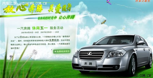 一汽奔腾始终把服务当作自己的一条生存命脉,一直坚持"质量是硬件,服务是软件"的经营理念。奔腾轿车品质的不断提高,为用户带来不断的惊喜;而服务的不断升级,则体现了一汽轿车强烈的用户责任感。服务与品质并行,一汽奔腾正在成为中高级轿车的价值典范,让用户从买车到用车、从开车到养车全都后顾无忧。一汽奔腾开展的售前、售中及售后的系列服务活动,诠释其“人、车共同关爱”的服务理念,为消费者提供切实可行,也是用户真正需要的服务。