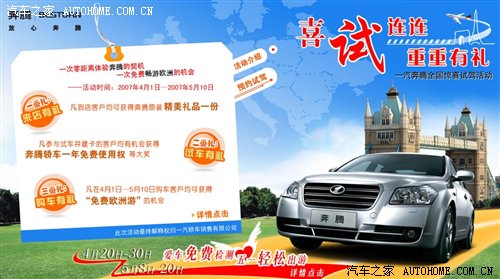 在售中服务环节方面,一汽奔腾在销售过程中直接或间接为顾客提供各项服务的基础上,进一步细化了售中服务。曾推出的“喜试连连,重重大礼”惊喜试驾活动,不仅到奔腾销售服务中心展厅看车的客户均可获得奔腾精美礼品一份,参与试车并建卡的客户还有机会赢取免费使用奔腾轿车一年的奖项和免费欧洲游的超值大奖,使消费者能够尽情享受奔腾轿车带来的驾驭快感和超值享受。
