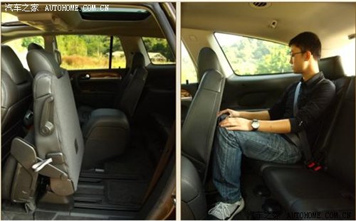 第三排座椅还是得益于中间排座椅的聪明设计。只需要轻轻一个动作,就可以将中间排座椅推至最前面,让第三排方便地进出;第三排的腿部空间比较一般,但是中排座椅可以前后移动,所以只要中间迁就一点,第三排还是可以比较宽松地乘坐的。