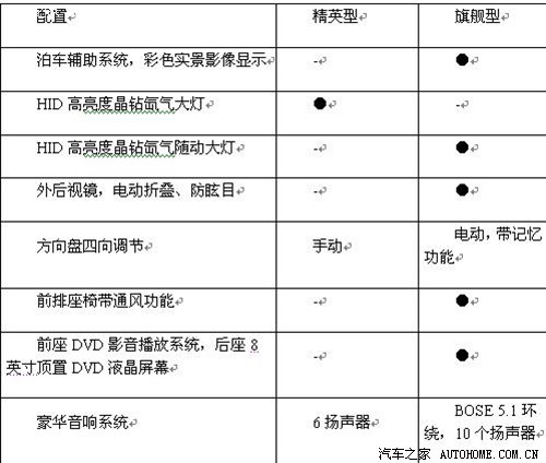 昂科雷的前排装备齐全,而更多的亮点在于后排——空调为三区独立空调,可独立控制后两排的温度;另外还有一套后排的DVD影音系统,包括10喇叭的BOSE 5.1声道音响、8英寸车顶显示屏、两个红外线耳机。三区独立空调、双天窗、总统座椅等装备都是标配的,精英版跟旗舰版相差的有如下装备: