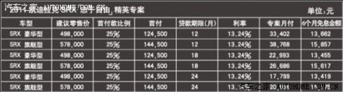 根据“忠于自由”精英专案,从现在起至9月30日,购买凯迪拉克SRX各款车型只需首付25%,余款可选择12、18或24个月分期付款,其中前6个月可以享受免息。举例来说,如果顾客选择通过专案购买价值49.8万元的凯迪拉克SRX,首付25%只需12.45万元,选择12个月贷款期的方案每月只需支付33402元,前6个月的免息期总共可以获得13662元的免息金额。具体车型的首付金额、月付金额及6个月的免息金额如下表所示。