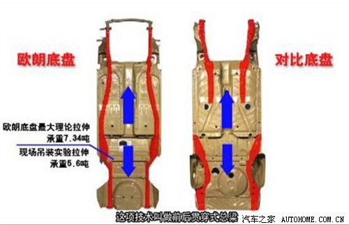 欧朗完美的承载了大于自身五倍的重量而车身不变形。能够做到这一点,是因为欧朗拥有的前后贯通式地板纵梁技术。从图片中可以看到,欧朗地板与其它车型地板的明显不同。图片中左侧为欧朗的地板,右侧为对比车的地板。地板黄色部分为纵梁,纵梁是轿车的主要承载零件,欧朗纵梁前后贯通,而对比车的纵梁在中部断开,欧朗车的承载能力要远远高于对比车,加上欧朗大量应用的高强钢使得欧朗车身在抗弯、抗扭、抗拉强度及车体抗撞性上要远远高于同级别车。