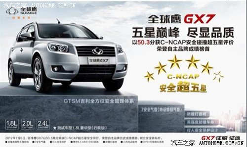 总结:凭借优秀的车身结构设计,全球鹰GX7以50.3的高分刷新了自主汽车碰撞记录,一举获得“首款自主超五星安全汽车”的荣誉称号。车身结构是一个企业的基本功,只有练好这个基本功,才能具备一流安全品质的前提,吉利在这方面为自主汽车做了表率,全球鹰GX7的宣传口号是“征服征途”,正如这个口号所表达的,这家自主企业的超五星之路会征服更多高点,越走越宽远。