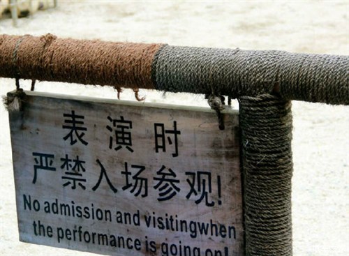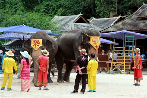 首先到了野象谷观看大象的表演。表演场边上挂着这个醒目的提示牌。看到这些庞然大物,不挂警示牌,我们也不敢进去啊。