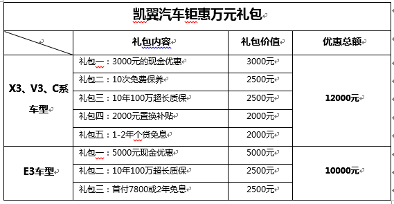 为感谢广大消费者对于凯翼X3的支持和厚爱,凯翼汽车在X3上市一年之际,推出“夏季钜惠万元礼 凯翼汽车大放价”的优惠政策,从即日起至6月30日,购买凯翼旗下任一款产品,均可享受送现金、送保养、送保险、送补贴、零利率/超低利率等等实惠好礼。活动期间,凡购买凯翼旗下的X3、V3、C3和C3R车型任意一款车型,均可享受3千元现金优惠、十次免保、十年一百万公里的质保、2000元置换补贴以及,1年期免息全额贴息和2年期免息补贴2000元的个贷免洗政策,总额最高达到12000元。而E3车型则享现金优惠5000元、10年100万公里的发动机超长质保以及首付7800元或两年免息的2500元以上现金补贴。