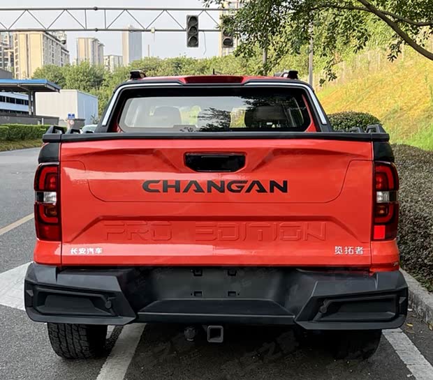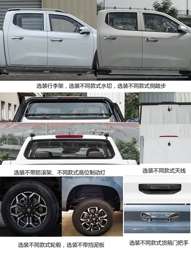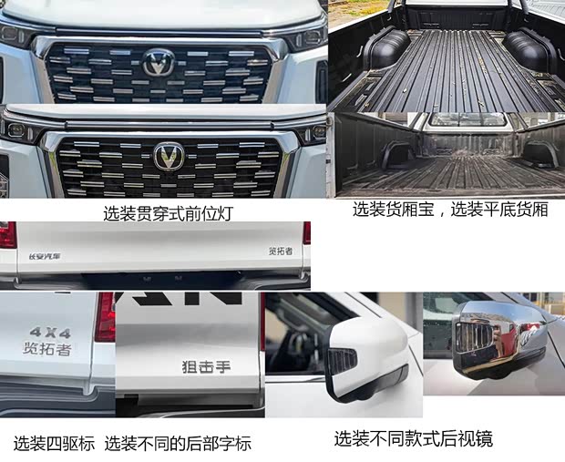 常规版本根据配置的不同,该车会在侧面踏板、龙门架、外后视镜、前雾灯、货箱钩、贯穿式灯组、轮圈等细节上会有差异。在申报图中我们可以看到“览拓者”和“狙击手”两个尾标,未来的正式命名应该就是二选一。